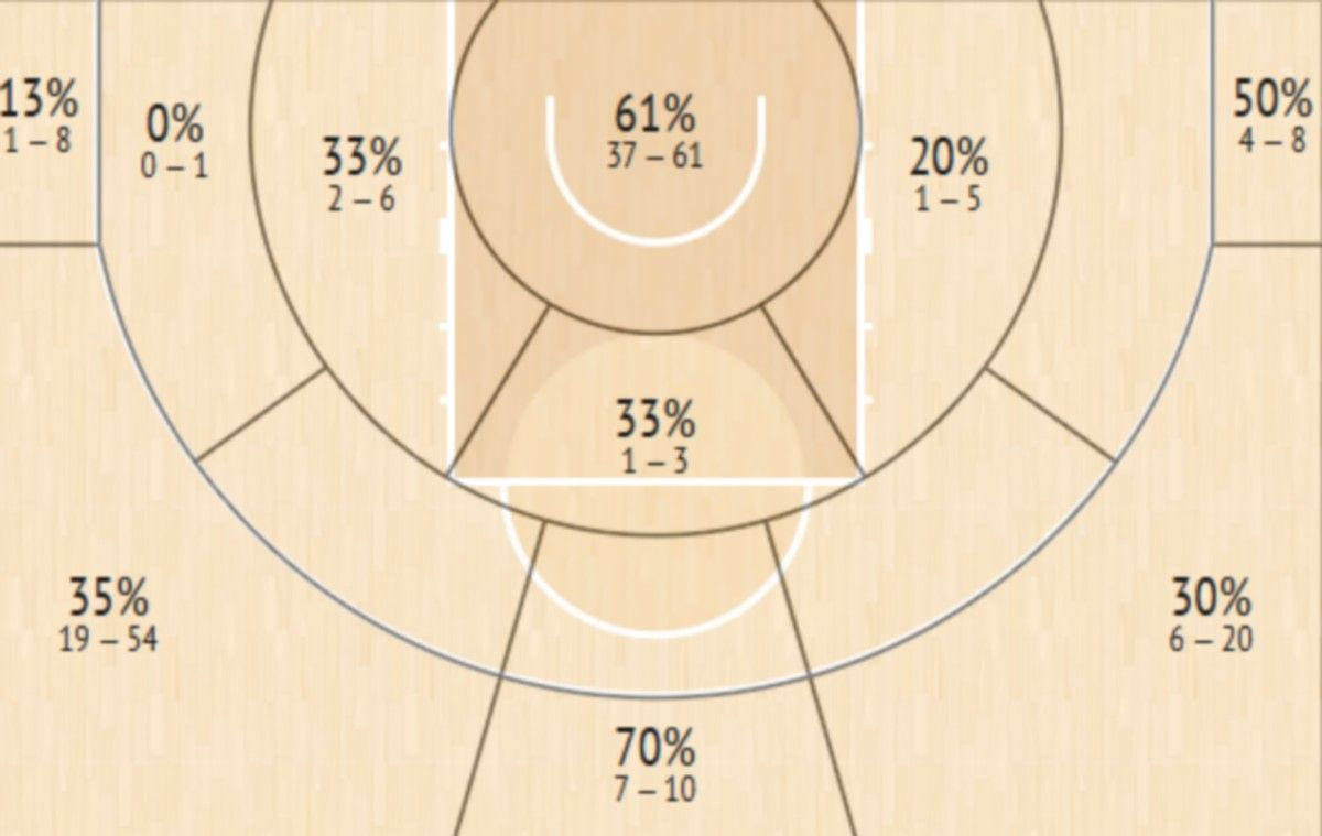 Οι αριθμοί του: 8 πόντοι και 3.7 ριμπάουντ μέσο όρο με 63.7% στα δίποντα σε 14 λεπτά συμμετοχής (24 αγώνες – 6 ως βασικός)